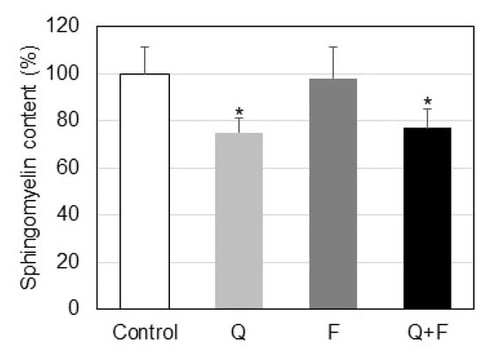 Sphingomyelin content in HepG2 cells untreated (Control) and treated with quercetin (Q) and fingolimod (F). Values are expressed as relative percentage participation in the total lipids. Values are means ± SD. Statistical significance is presented as comparison of treated cells with controls. * p < 0.01.