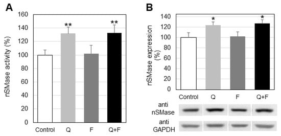 Changes in the activity (A) and protein expression (B) of neutral sphingomyelinase (nSMase) in control and treated with quercetin (Q) and fingolimod (F) HepG2 cells. Values are expressed as % of controls (100%). Representative images from Western blot analysis with specific antibodies to neutral sphingomyelinase (anti-nSMase) are shown at the lowermost of panel B. Reaction with anti-glyceraldehyde-3-phosphate dehydrogenase antibodies (anti-GAPDH) was used as an internal control for loading. Values are means ± SD. Statistical significance is presented as comparison of treated cells with controls. * p < 0.05; ** p < 0.01.