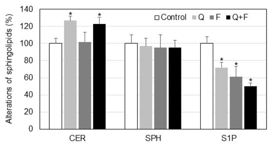 The effect of quercetin, with and without fingolimod, on the major sphingolipid metabolites was also determined (Figure 4). The change of CER levels was statistically significant only in the cases when quercetin was involved in the treatment and fingolimod alone did not induce any noticeable alterations. The level of SPH showed slight changes in all three types of treatments, but the observed differences were not statistically significant compared to controls. However, the level of S1P was gradually decreased in the following order of treatment: quercetin, fingolimod, quercetin + fingolimod, showing that the combined treatment produced a stronger effect on the level of S1P compared to each one of the individual treatments (Figure 4). Accordingly, in our previous studies we observed a decrease in the level of S1P in resveratrol-treated A549 lung adenocarcinoma cells []. However, Charytoniuk et al. reported an increase of S1P in resveratrol-treated HepG2 cells in a lipid overload state, which might be related to a more complicated lipid metabolism in cells overloaded with lipid precursors []. Nevertheless, these authors reported an increase in active caspase 3, which is indicative of stimulated apoptotic processes.