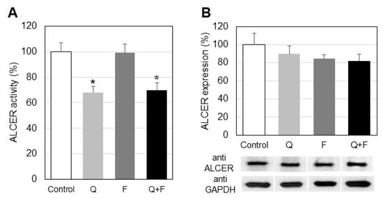 Alteration in the activity (A) and protein expression (B) of alkaline ceramidase (ALCER) in control and treated with quercetin (Q) and fingolimod (F) HepG2 cells. Values are expressed as % of controls (100%). Representative images from Western blot analysis with specific antibodies to alkaline ceramidase (anti-ALCER) are shown at the bottom of panel B. Reaction with anti-glyceraldehyde-3-phosphate dehydrogenase antibodies (anti-GAPDH) was used as an internal control for loading. Values are means ± SD. Statistical significance is presented as comparison of treated cells with controls. * p < 0.01.