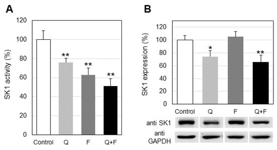 Changes in the activity (A) and protein expression (B) of sphingosine kinase 1 (SK1) in control and treated with quercetin (Q) and fingolimod (F) HepG2 cells. Values are expressed as % of controls (100%). Representative images from Western blot analysis with specific antibodies to sphingosine kinase 1 (anti-SK1) are shown at the lowermost of panel B. Reaction with anti-glyceraldehyde-3-phosphate dehydrogenase antibodies (anti-GAPDH) was used as an internal control for loading. Values are means ± SD. Statistical significance is presented as comparison of treated cells with controls. * p < 0.05; ** p < 0.01.