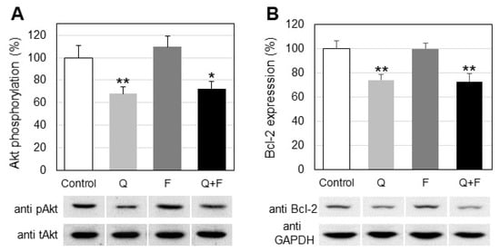 Changes in Akt phosphorylation (A) and Bcl-2 expression (B) in control and treated with quercetin (Q) and fingolimod (F) HepG2 cells. Values are expressed as % of controls. Representative images from Western blot analysis with specific antibodies to phosphorylated Akt (anti-pAkt) and B cell lymphoma 2 protein (anti-Bcl-2) are shown at the lowermost of the panels. Reactions with antibodies against total Akt (tAkt) and anti-glyceraldehyde-3-phosphate dehydrogenase antibodies (anti-GAPDH) were used as internal controls for loading. Values are means ± SD. Statistical significance is presented as comparison of treated cells with controls. * p < 0.05; ** p < 0.01.