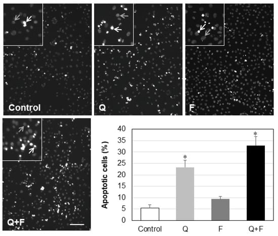 Apoptotic response of HepG2 cells after treatment with quercetin (Q), fingolimod (F) or combination of both drugs (Q + F). Apoptotic (white arrows in the insets) and non-apoptotic (gray arrows in the insets) nuclei were scored, and the percentage of apoptotic cells in each sample was determined. Bar, 100 µm. * p < 0.001.