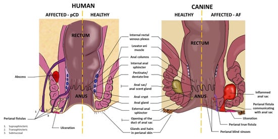 An interesting approach in translational research is the concept of exploiting the similarities between diseases affecting humans and companion animals [,]. Our four-legged friends are influenced by civilization factors, which include highly processed food, exposure to chronic stress, lack of exercise, low-diversity mucosal microbiota, air pollution, and others. Not surprisingly, dogs and cats are diagnosed with many diseases that are very similar to those found in humans—they have a corresponding pathogenesis, course, and response to treatment. Conditions related to the dysfunction of the immune system occupy an important place here []. Dogs can develop, for example, inflammatory bowel disease (considered a model of IBD in humans), dry conjunctivitis, and keratitis (considered a model of Sjögren’s syndrome), atopic dermatitis, pemphigus deciduous, lupus erythematosus, type I diabetes, as well as anal furunculosis (considered a model of perianal fistulas in CD disease). The later condition is the focus of this article. It has been postulated that testing the effects of cell transplantations in companion animals with naturally occurring human-like diseases may provide bi-directional benefits: contribute to the development of new therapies for veterinary medicine and create unique predictive values for the outcome of human clinical trials []. With regard to perianal fistulas, only one report demonstrates the effect of local MSC transplantation in naturally affected dogs []. In this study, human-embryonic-stem-cell-derived MSCs were injected around the perianal sinuses in six dogs with AF. The procedure was well tolerated, and at 3 months all dogs were completely free of fistulas (the concomitant pharmacological treatment was maintained for at least 30 days after cell transplantation). These results, although very preliminary, encourage further research in this area. Of course, testing new therapies in companion animals must be conducted in accordance with the medical art and local ethical regulations. Additionally, such trials must be accompanied by full awareness that dogs enrolled to the study are veterinary patients and not experimental animals. A “primum non nocere” basis must be a priority in this kind of studies. Thus, the use of companion animals for testing new therapies should only be done when there are already strong indications that the procedure is not harmful and potentially beneficial. MSC transplantations meet both of these conditions. This kind of research is in agreement with One Health perspective—a collaborative, transdisciplinary approach aimed at achieving optimal health outcomes recognizing the interconnection between people, animals, and their shared environment [,]. However, as pointed out by Kol et al., the identification of the naturally occurring disease “model” in companion animals for a given human disease requires in-depth comparative analysis of numerous issues such as anatomy, pathology, clinical manifestations and response to treatment []. Although canine anal furunculosis has been indicated several times as a condition analogous to human fistulas in Crohn’s disease [,,,], a comprehensive, multi-layered juxtaposition of these two diseases has not been presented in the literature. This type of comparative survey based on the available data on canine AF and human pCD is the main focus of the present article.