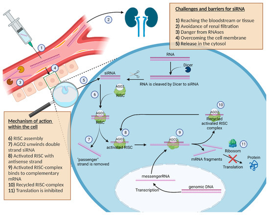 Schematic illustration about the challenges, barriers and the mechanism of action of siRNA in the cell. Furthermore, the figure shows the journey of siRNA starting at the injection site to the cell cytosol, where siRNA can exert its pharmacological effect. The description is in the box inside the picture.