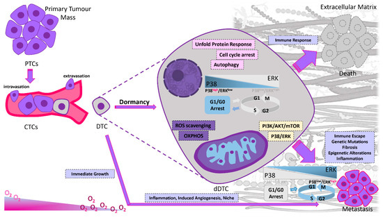 Dormancy in cancer progression. Primary tumor cells can leave the primary tumor site and enter the blood circulation as circulating tumor cells (CTCs). When CTCs reach a target organ, they seed into the new tissue as DTCs. Their fate is diverse depending on their cell autonomous intracellular signals and due to the local environmental signals. If DTCs fail to adapt to the new microenvironment they die due to different immune responses. If the local microenvironment can provide missing complementary cues to the DTCs, they can resume their proliferative properties. When DTCs are challenging a hostile environment may enter a dormant state due to the interactions of extracellular factors (mainly hypoxia and immune cytotoxicity) and intracellular pathways. In response to signals that are not fully elucidated but appear to involve modifications of tumor microenvironment, such as extracellular matrix remodeling, fibrosis, neovascularization, epigenetic alterations, chronic inflammation, immune escape, genetic mutations and tissue specific mechanisms in each metastatic site, tumor cells escape from dormancy, start to proliferate and ultimately form macroscopic metastases in target organs. Proliferating DTCs have to evade the immune system; otherwise, the immune system will keep them in check by preventing their expansion. The balance between activated extracellular signal-regulated kinases (ERK1/2) and activated p38α/β has been correlated to cell dormancy in vitro and in vivo. The ERK/p38 ratio is indicative of the dormant phenotype; a high ratio induces tumor growth, whereas a low ratio promotes tumor dormancy. P38 drives a downstream program that resembles endoplasmic reticulum (ER) stress and coordinates a stress-related transcriptional program. Activation of the p38 MAPK in dormant cells induces the unfolded-protein response (UPR). Reduced PI3K/AKT signaling due to extracellular regulation as a response to environmental signals plays a key role in switching between cell proliferation and dormancy. Quiescent cancer cells mainly depend on OXPHOS and lipid oxidation for their survival. Specific molecular pathways regulate the metabolic shift toward OXPHOS in these cells. Despite the activation of glycolysis or OXPHOS, the AMPK stress response maintains a quiescent state by repressing cellular proliferation through mTOR inhibition. Autophagy sustains the acquisition of a dormant phenotype by providing appropriate energy balance under metabolic stress and by managing the ROS accumulation.
