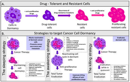 Strategies to target cancer cell dormancy. (A) Dormancy is identified as a key feature of cells surviving their first exposure to anti-proliferative cancer drugs. Drug tolerant cells are able to escape the highly selective pressure of anti-proliferative agents and become resistant. Although drug tolerance is a transient non mutational phenotype, rare drug-resistant mutations occur. Drug tolerant persisted cells resume normal growth even in the presence of a drug and form colonies. These drug-resistant cancer cell colonies can proliferate even in the presence of anti-proliferative drugs. (B) Overview of the current pharmacological strategies that aim to (i) maintain cancer cells in the dormant state, (ii) reactivate dormant cells to increase their susceptibility to anti-proliferative drugs, and (iii) eradicate dormant cancer cells while in quiescent. The maintenance of cancer cells in a dormant state can be achieved by suppressing proliferative signaling, activating dormant pathways, or delivering components of the dormant niches. The reactivation of the dormant cells is reached by targeting dormancy-promoting components secreted by the microenvironment in order to force dormant cells into the cell cycle. The elimination of the dormant cancer cells can be accomplished by designing drugs that will directly kill disseminating tumor cells.