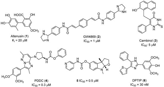 - Rojas, C.; Barnaeva, E.; Thomas, A.G.; Hu, X.; Southall, N.; Marugan, J.; Chaudhuri, A.D.; Yoo, S.-W.; Hin, N.; Stepanek, O.; et al. DPTIP, a Newly Identified Potent Brain Penetrant Neutral Sphingomyelinase 2 Inhibitor, Regulates Astrocyte-Peripheral Immune Communication Following Brain Inflammation. Sci. Rep. 2018, 8, 17715. [Google Scholar] [CrossRef] [PubMed]