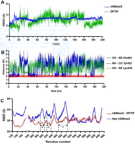 3.4. nSMase2 3D Model: Modelling, Docking and Molecular Dynamics Simulations