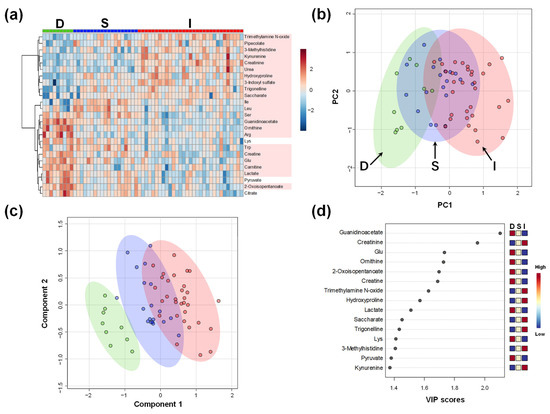 Overall metabolomic plasma profile of all participants in D, S, and I Groups. (a) Heatmap to visualize the metabolomic profile. Absolute concentrations are divided by the median value of each sample, log2-transformed, and converted to Z-score. Metabolites showing high variation among the three groups (top 25 by analysis of variance) are visualized. The metabolites showing p < 0.05 (ANOVA) are colored; (b) Score plots of principal component (PC) analysis. The contribution ratios are 20.2% and 12.7% for the first and second PC (PC1 and PC2), respectively. Green, blue, and red dots indicate data in D, S, and I Groups. The corresponding ellipses show 95% confidence intervals; (c) Score plots of partial least squares-discriminant analysis (PLS-DA). R2 and Q2 of leave-one-out-cross-validation are 0.82 and 0.70, respectively. The dots and ellipses are the same as the ones in the panel (c); (d) Variable importance of projection (VIP) scores of PLS-DA. D, Donor group; S, kidney transplant recipients with stable kidney function; I, kidney transplant recipients with impaired kidney function.