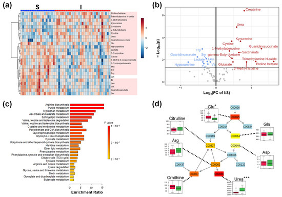 Next, we compared the metabolomic profiles of Groups S and I. Clustering showed a clear difference in the metabolomic profiles between the S and I groups (Figure 2a). Except for Lys, all metabolites in the heatmap showed p < 0.05 (Mann–Whitney test). Volcano plots revealed that the metabolite concentrations of 12 metabolites were higher and those of 9 metabolites were significantly lower in Group I than those in Group S (Figure 2b). Creatinine showed the largest −log10(P), that is, the smallest p-value. Urea and guanidinoacetate were present in higher concentrations. Meanwhile, lactate, an end product of glycolysis, and many amino acids, such as tryptophan (Trp), serine (Ser), leucine (Leu), valine (Val), and tyrosine (Tyr), showed lower concentrations. Furthermore, the enrichment analysis showed that arginine biosynthesis had the smallest p-value (Figure 2c). Seven metabolites, glutamine (Gln), glutamic acid (Glu), aspartic acid (Asp), arginine (Arg), ornithine, citrulline, and urea, were mapped to this pathway (Figure 2d).