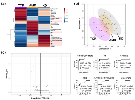 The difference in the plasma metabolomic profile of participants with kidney transplantation (groups TCR, AMR, and KD). (a) Heatmap of metabolomic profile. The processing is the same as the legends in Figure 1a. Subsequently, the data were averaged for each group. No metabolite shows FDR-adjusted p < 0.05; (b) Score plots of PLS-DA using the metabolites shown in panel (a). R2 and Q2 of leave-one-out-cross-validation are 0.82 and 0.51, respectively; (c) Volcano plots between TCR and KD. The horizontal line indicates −log10(P) = 1.3, i.e., FDR-adjusted p = 0.05. The area under the receiver operating characteristic (ROC) curves (AUC) is shown for the metabolites with p < 0.05 (without FDR correction). TCR, T cell-mediated rejection group; AMR, antibody-mediated rejection group; KD, kidney dysfunction other than rejection group.