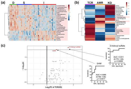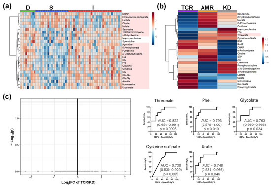 The urinary metabolomic profile. (a) Heatmap of groups D, S, and I; (b) Heatmap of groups TCR, AMR, and KD; (c) Volcano plots between TCR and KD. The processing is the same as the legends in Figure 1a, Figure 2b and Figure 3a. D, Donor group; S, kidney transplant recipients with stable kidney function; I, kidney transplant recipients with impaired kidney function; TCR, T cell-mediated rejection group; AMR, antibody-mediated rejection group; KD, kidney dysfunction other than rejection group.