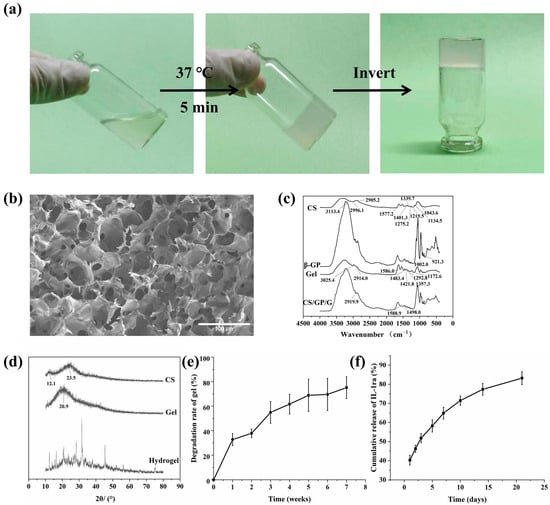 Characterizations of CS/β-GP/gelatin thermosensitive hydrogels. (a) Image of CS/β-GP/gelatin mixed solution transformed into hydrogel after 5 min at 37 °C. (b) Optical microscope images of chitosan/β-GP/gelatin thermosensitive hydrogel. (c) FT-IR spectra for chitosan, β-GP, gelatin, and chitosan/β-GP/gelatin thermosensitive hydrogel. (d) XRD patterns of chitosan, gelatin, and chitosan/β-GP/gelatin thermosensitive hydrogel. (e) Degradation percentage curve of CS/β-GP/gelatin hydrogel. (f) The release percentage curve of IL-1ra from CS/β-GP/gelatin hydrogel.