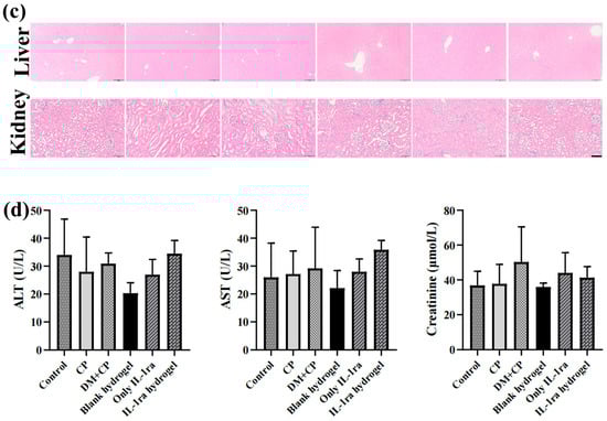 Previous experimental results show that 10 μg/mL IL-1ra can inhibit the release of inflammatory factors in a simulated in vitro inflammatory environment. In this experiment, the dose of IL-1ra is much higher than the required dose. The results of the cell experiment showed that the cell survival rate of RAW264.7 cells cultured with high sugar extract loaded with IL-Ra for 24 and 48 h was not significantly different from that of the control groups (p > 0.05). (Figure 2a) In order to prove the biocompatibility of IL-1ra CS/β-GP/gel hydrogel in vivo, we randomly divided rats into six groups for H&E staining of liver and kidney (Figure 2c), and there was no significant difference among the groups. In the analysis of liver and kidney indexes in rat serum, we found no significant difference in AST, ALT, and Cr (Figure 2d) in the rat serum of each group (p > 0.05).