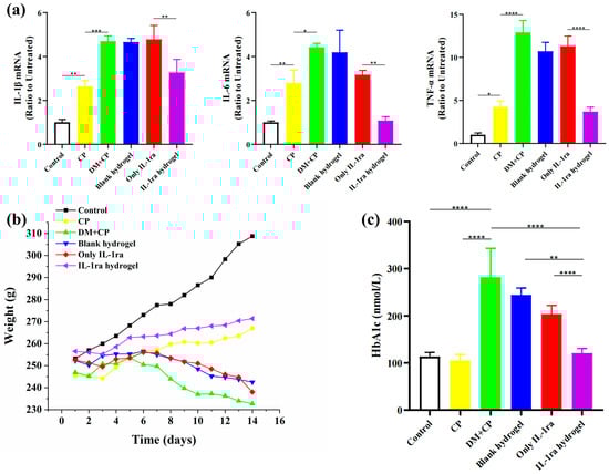 To evaluate the effect of the hydrogel loaded with IL-1ra CS/β-GP/Gel on diabetic periodontitis rats, we monitored the changes in body weight (Figure 3b) and blood sugar of rats from the start of ligation. At this time, the rats injected with STZ had dull hair, listlessness, decreased activity, a slow response, significantly increased food and water consumption, increased urine output, and decreased body weight, which showed typical “three more and one less” symptoms, and the diabetes model was established. We observed that the weight of rats in the blank control group without any treatment showed a steady upward trend.