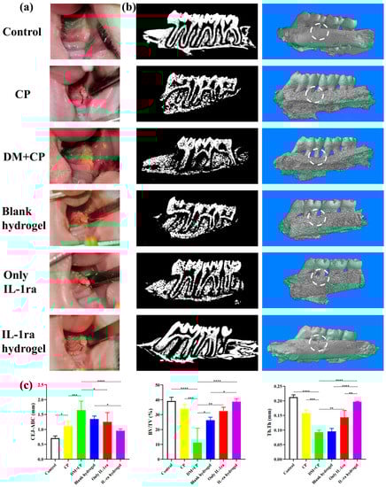 The general oral view of rats showed that the gums of normal rats were pink and hard on palpation, while the gums of periodontitis rats were dark red and blood exudation was observed on exploration (Figure 4a). A large amount of food residue was observed in the mouth of diabetic periodontitis rats, covering all of the crowns of the first molars and 1/2 of the second molars in the right maxillary. In the rats treated with IL-1ra alone and blank hydrogel, the gingival bleeding was not significantly alleviated after exploration, and obvious food debris was still visible around the first molar. After treatment with IL-1ra CS/β-GP/Gel hydrogel, gingival bleeding was alleviated and no obvious food residue was observed.