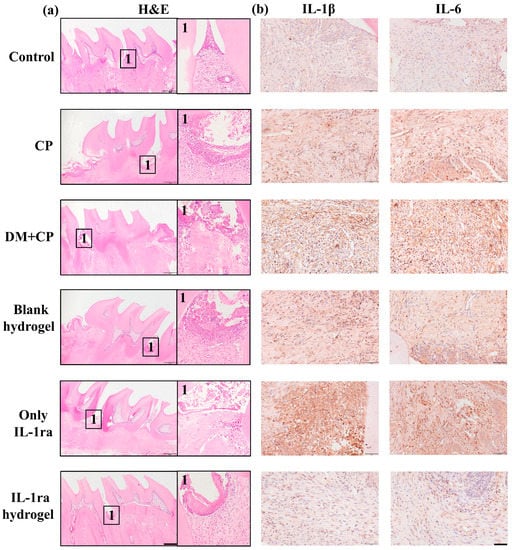 We next stained the periodontal tissues of rats to further evaluate the experimental results of IL-1ra CS/β-GP/Gel hydrogel inhibiting periodontitis in diabetic rats. The results of H&E (Figure 5a) showed that collagen fibers were arranged orderly in the periodontal supporting tissues of healthy rats, the alveolar bone surface was smooth, no obvious osteoclasts and bone lacunae were formed, and the gingival epithelium became a slender strip with a complete structure. In contrast, the normal epithelial structure of periodontitis rats was destroyed, the combined epithelium extended to the root, and deep periodontal pockets were formed. Collagen fibers in the gingival sulcus epithelium and connective tissue below the combined epithelium presented with edema and degeneration, forming unstructured tissue, and extensive inflammatory cell infiltrate. Inflammation in rats with diabetes mellitus was more obvious, and the alveolar bone was absorbed and destroyed to different degrees. After IL-1ra CS/β-GP/Gel hydrogel treatment, the gingival epithelial structure was destroyed, but the inflammatory cell infiltration decreased. There was no significant difference in staining results between the IL-1ra alone and blank hydrogel treatment groups and diabetic periodontitis group.