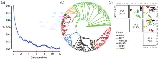 This study is based on 234 doubled haploid (DH) lines derived from six biparental families (Table S1). All lines were sequenced for genotyping with a sequencing depth of ~14X for the parents and ~2X for the progeny (Figure S1), so after quality checks, 136,792 single nucleotide polymorphisms (SNPs) were obtained. These high-quality SNPs were used to molecularly characterize the population. The SNPs were evenly distributed in the genome and linkage disequilibrium decayed with physical distance to r2 equal to 0.2 after around 11 Mb (Figure 2a). Phylogenetic analysis was consistent with the pedigree information, separating the lines into six families. The female parent of the population BJNL (Jing2481) and the male parent of HNND (Jing24) was selected from the same cross, which resulted in the two families, HNND and BJNL, being more closely related and grouped (Figure 2b). The first three principal components explained 26.2%, 13.4%, and 7.6% of the variance, and the six families were clearly separated by the first two principal components (Figure 2c).