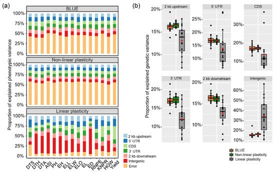 Contribution of different gene regions to genotypic performance and plasticity. Proportion of (a) phenotypic and (b) genetic variance explained by SNPs in six categories: 2 kb upstream, 5′ UTR, CDS, 3′ UTR, 2 kb downstream and intergenic, shown for the BLUE across seven environments, the non-linear plasticity, and the linear plasticity. DTS, days to silking; DTH, days to heading; DTA, days to anthesis; ASI, anthesis-silking interval; PH, plant height; EH, ear height; ELL, ear leaf length; ELW, ear leaf width; ELO, ear leaf order; EL, ear length; ED, ear diameter; RNPE, row number per ear; KNPR, kernel number per row; HGW, hundred-grain weight; Yield, yield per hectare. The black point indicate each value of trait. The red points indicate mean values.