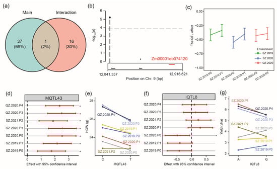 QTL mapping for main and locus-by-environment interactions. (a) Venn diagram of main QTL and G-by-E QTL for 15 traits. (b) Identification of the gene Zm00001eb374120 as main QTL MQTL38 (chromosome 9: 12.46–13.06 Mb) for ELW. (c) The effect of MQTL38 in paired environments. (d) Genotype × environment interaction effects (GGE)-type marker effect for main QTL MQTL43 (chromosome 9: 121.45–121.46 Mb) identified for hundred-grain weight (HGW). (e) Mean HGW of the two QTL alleles in the seven environments. (f) GGE-type marker effect for the interaction QTL IQTL8 (chromosome 2: ~214.58 Mb) identified for yield and (g) mean yield distribution of the two QTL alleles in the seven environments. The significance of GGE-type effects was tested by the Wald test, * means the effect is significant at the level of 0.05.
