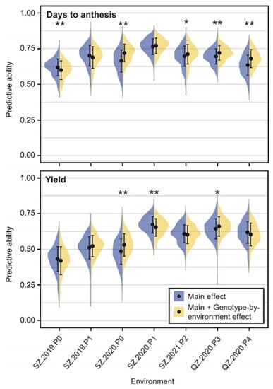 Genome-wide prediction results. Predictive ability in each environment using a model with only marker main effects or integrating main and genotype-by-environment interaction effects shown for days to anthesis and yield per hectare. The significance test between the two models was performed by t test. *, significant at 0.05 level; **, significant at 0.01 level. The point and bar represent mean and standard deviation value, respectively.