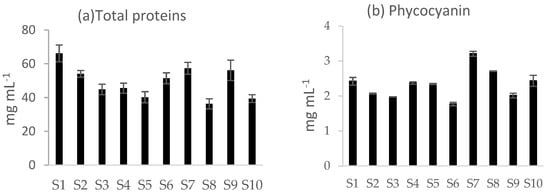 In addition to inorganic compounds, iron can bind to biomolecules, of which proteins, amino acids, and heme are of particular interest. All these molecules are present mostly in the soluble fraction of extracts. The concentration of total proteins varied from 36.3 mg mL−1 in sample S8 to 66.2 mg mL−1 in sample S1 (Figure 1a), while the concentration of phycocyanin varied from 1.77 mg mL−1 in sample S6 to 3.21 mg mL−1 in sample S7 (Figure 1b).
