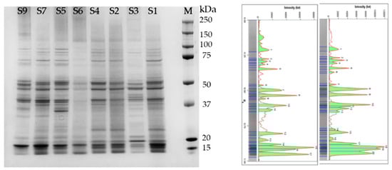 The 1D proteomics analysis of Arthrospira spp. soluble fractions from commercial samples. Proteins (3 µg) were separated using SDS-PAGE (12%) and stained with Coomassie® Brilliant Blue R-250. Left: representative gel; lanes 1–8: soluble extracts of samples S1, S2, S3, S4, S5, S6, S7 and S9; lane 10 (M): molecular mass marker (Precision Plus Protein Standard, Biorad); right: representative pherograms obtained from samples S4 and S2.