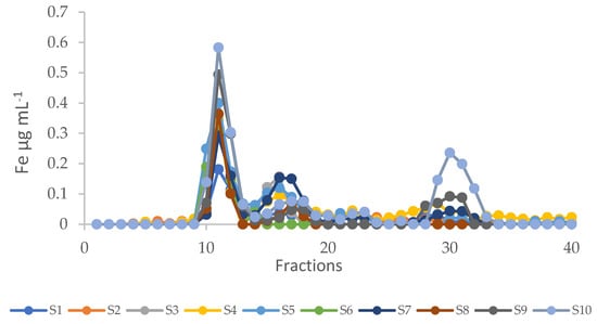 Iron chromatographic profiles after size exclusion chromatography of extracts from samples S1–S10. Iron concentration is expressed as µg mL−1.