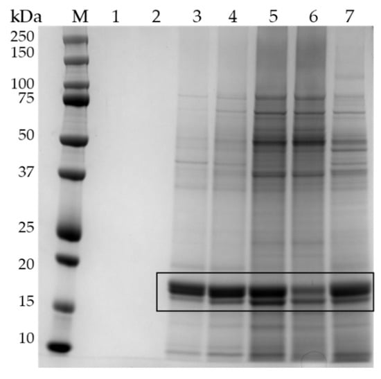 Representative SDS-PAGE gel (4–12%, Coomassie staining) of proteins contained in fractions obtained after size exclusion chromatography of cellular extracts. M: molecular mass marker; lanes 1–2: fraction 31 of samples S9 and S10; lanes 3–7: fraction 11 of samples S8, S4, S1, S9, and S7, respectively. Rectangle indicates the bands at 18 and 17 kDa containing the subunits of the phycocyanin.