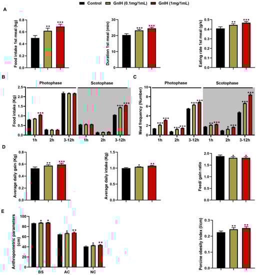Intraperitoneally injected GnIH increases food intake, alters meal microstructure, decreases feed/gain ratio and increases body mass in piglets. (A) Effect of GnIH injected intraperitoneally on the structure of first meal in the fasting piglets. (B,C) The food intake (B) and meal frequency (C) were monitored over 14 days during different periods of the photophase and scotophase post-GnIH or vehicle injection in the ad libitum-fed piglets. (D) The average daily feed intake, average daily gain and feed/gain ratio of piglets intraperitoneally injected with different chronic doses of GnIH. (E) Anthropometric parameters and porcine obesity index of piglets intraperitoneally injected with different chronic doses of GnIH. BS, body size; AC, abdominal circumference; NC, neck circumference; POI, porcine obesity index. n = 5/group. The data are presented as the means ±SEM. * p < 0.05, ** p < 0.01 and *** p < 0.001 GnIH vs. vehicle.
