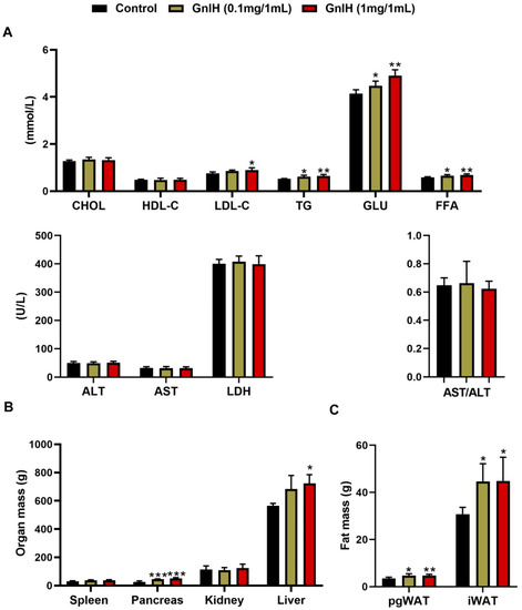 To investigate what were the reasons which contributed to the significantly elevated GnIH-induced body mass in piglets, the serum biochemical indexes were measured. As shown in Figure 2A, chronic intraperitoneally injected GnIH in a dose-dependent manner significantly increased the concentrations of TG (p < 0.05 and p < 0.01), FFA (p < 0.05 and p < 0.01) and GLU (p < 0.05 and p < 0.01). The concentration of LDL-C was only increased at the high dose of the GnIH group, whereas no differences were observed in the CHOL, HDL-C, LDH, ALT and AST after a chronic GnIH injection compared with the vehicle-treated piglets. In addition, no differences in the AST/ALT values were calculated between the groups, indicating that all animals did not develop hepatitis after a GnIH administration during the study.