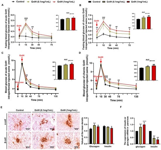 Effects of intraperitoneally injected GnIH on glucose homeostasis and islet histomorphology changes. (A,B) The fasting blood glucose levels of piglets were measured at different time points after intraperitoneally injecting different acute (A) or chronic (B) doses of GnIH or vehicle into rats that had fasted for 8 h. The upper panel shows the total area under the curve (AUC) for fasting blood glucose after GnIH or vehicle injection from 0 to 60 min. (C,D) For the intraperitoneal glucose tolerance test, blood glucose concentrations were measured in ad libitum-fed piglets that had been administered different acute (C) or chronic (D) doses of GnIH or vehicle. The upper panel shows the total AUC values for blood glucose after the administration of different doses of GnIH or vehicle from 0 to 120 min. (E) Representative immunohistochemistry images and mean densitometric values for glucagon or insulin in islets of pancreatic sections from piglets administered different chronic doses of GnIH or vehicle for 14 days. Scare bars: 25 μm. (F) Glucagon- and insulin-related gene expression in the pancreases of piglets administered different chronic doses of GnIH or vehicle for 14 days. n = 5/group. The data are presented as the means ±SEM. * p < 0.05, ** p < 0.01 and *** p < 0.001 GnIH 0.1 mg/1 mL vs. vehicle; # p < 0.05, ## p < 0.01 and ### p < 0.001 GnIH 1 mg/1 mL vs. vehicle.