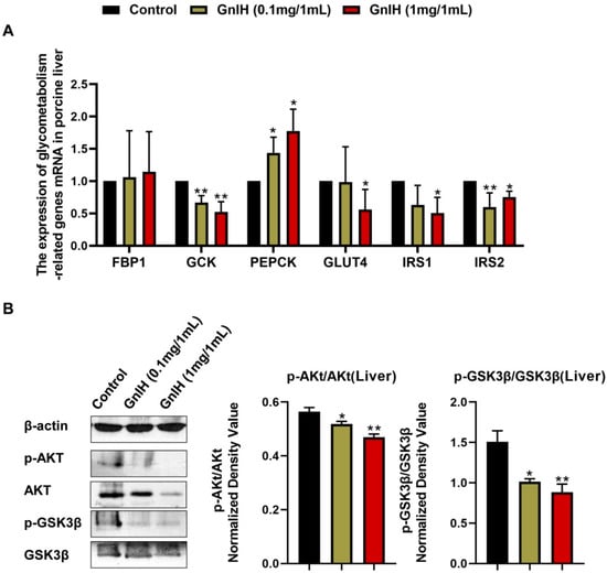 To elucidate the molecular mechanism underlying the GnIH-mediated glucose metabolism disorders, the expression of glucometabolism-related genes was detected in the liver of piglets administered with chronic doses of GnIH. Compared to the vehicle-treated piglets, the IRS2 (insulin receptor substrate 2) and GCK (glucokinase) mRNA expression levels were significantly diminished (p < 0.05 and p < 0.01), whereas the PEPCK (phosphoenolpyruvate caboxykinase) mRNA expression levels were significantly increased (p < 0.05) in the piglets who were injected with high and low doses of GnIH. However, the GLUT4 (glucose transporter 4) and IRS1 mRNA expression levels were only significantly decreased (p < 0.05) in the high-dose GnIH group. Moreover, no difference was observed in the mRNA expression levels of FBP1 (fructose-1,6-bisphosphatase 1) after the GnIH injection compared with vehicle-treated piglets (Figure 4A). In addition, we further assessed whether GnIH regulates the insulin-associated AKT-GSK3β signaling cascade in the liver of piglets. The results showed that the GnIH-induced phosphorylation of AKT and GSK3β significantly decreased (p < 0.05 and p < 0.01) in a dose-dependent manner (Figure 4B).