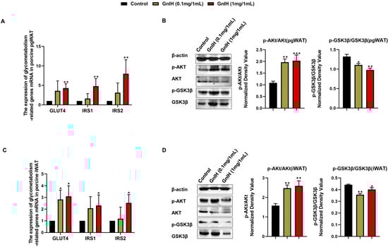 The Western blot results showed that the GnIH-induced phosphorylation of AKT markedly increased (p < 0.01 and p < 0.001) in a dose-dependent manner in iWAT and pgWAT. In contrast, the GnIH-induced phosphorylation of GSK3-β was significantly decreased (p < 0.05 and p < 0.01) in the iWAT and pgWAT, compared to the vehicle-treated piglets (Figure 5B,D).