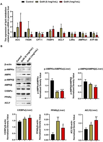 To reveal the molecular mechanism underlying the GnIH-induced liver mass increase and hyperlipidemia after the chronic GnIH injections in piglets, we subsequently examined the mRNA expression levels of lipid metabolism-related genes in the liver. As shown in Figure 6A, a high dose of GnIH induced a notable increase in the ACC (acetyl-CoA carboxylase) and FABP4 (fatty acid binding protein 4) mRNA expression levels (p < 0.05). On the contrary, GnIH markedly decreased (p < 0.05 and p < 0.01) the expression levels of CPT-1 (carnitine acyltransferase I), AMPKα1 (AMP-activated protein kinase α1), LXRα (liver X receptorsα) and ATP-5B (ATP synthase 5B) in a dose-dependent manner. Simultaneously, no significant difference was observed in the expression levels of FASN (fatty acid synthase) and ACLY (ATP citrate lyase) after a GnIH injection compared with the vehicle-treated piglets in the liver.