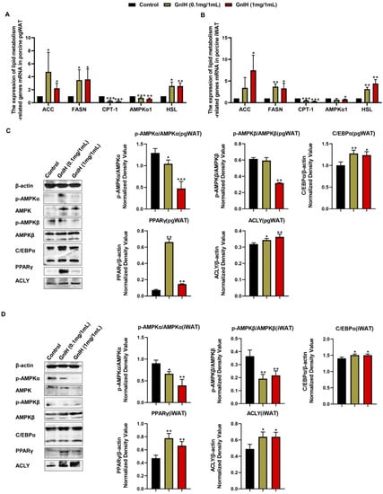 The Western blot results showed that GnIH notably inhibited (p < 0.05, p < 0.01 and p < 0.001) the phosphorylation of AMPKα in a dose-dependent manner both in the iWAT and pgWAT. Although a high dose of GnIH induced significant reductions in the phosphorylation of AMPKβ (p < 0.01) in the iWAT and pgWAT, only the low-dose treatment of GnIH showed a markedly suppressed (p < 0.01) AMPKβ phosphorylation in the iWAT. In contrast, all doses of GnIH induced significantly higher protein expression levels of C/EBPα, PPARγ and ACLY (p < 0.05 and p < 0.01) both in the iWAT and pgWAT (Figure 7C,D).