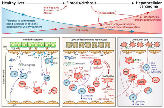 The liver immune microenvironment in the setting of a healthy liver, inflammation, and oncogenesis. This figure was reprinted from reference [12] and information on the license can be found at http://creativecommons.org/licenses/by/4.0/ (accessed on 12 October 2022).
