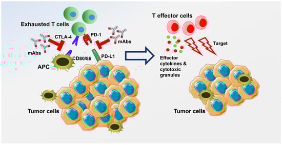 Immune checkpoints expressed on activated T cells lead to inhibition of T cell activation when bound to the ligand on tumor cells/antigen presenting cells. Examples of this include PD-1 and CTLA-4. These interactions are blocked with a monoclonal antibody (immune checkpoint inhibitor), which leads to T cell activation and targeting of tumor cells through release of effector cytokines and cytotoxic granules. This figure was reprinted with from reference [14] and information can be found at http://creativecommons.org/licenses/by/4.0/ (accessed on 12 October 2022).