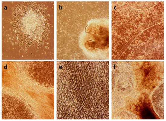 Changes in morphology of the cell cultures throughout the differentiation protocol. (a) MA1 line at day 4 of differentiation (10×). We can observe the centre of the clump still maintaining its stemness, whereas the border starts the differentiation process. (b) MA1 line at day 10 of differentiation (10×). The cells start to align while expanding from the undifferentiated clump. (c) C10 line at day 22 of differentiation (10×). Formation of myofiber-like structures. (d) C10 line at day 25 of differentiation (20×). We can observe in detail the structure of the myofibers formed in the differentiated culture. (e) C10 line at day 25 of differentiation (20×). Details of the alignment of the cells in the differentiated culture. (f) MA4 line at day 28 of differentiation (10×). The culture exhibits a great density, with formed myofiber-like structures.