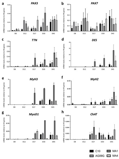 RT-qPCR analysis to assess the differentiation process from iPSCs to innervated skeletal muscle cells. The lines were evaluated at different time points during the differentiation process, at days (D) 8, 12, 17, 30 and 45. We analysed the evolution of the expression of different myogenic genes like PAX3 (a), PAX7 (b), TTN (c), DES (d), MyH3 (e), MyH2 (f) and MyoD1 (g), in addition to the motor neuron marker ChAT (h). The values represent the mean of at least three replicates, and they are relative to the expression mean of two housekeeping (HK) genes (HPRT and PPIA). Error bars show standard deviation.