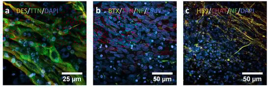 The expression of some key myogenic and motor neuron proteins was evaluated by immunocytochemistry at day 30 of differentiation (Figure 3). Differentiated cells expressed Titin and Desmin (sarcomere-related proteins) and they even exhibited a striated pattern and an aligned disposition typical of skeletal muscle cells (Figure 3a). The presence of neuromuscular junctions was also confirmed with an α-bungarotoxin (BTX) staining as we can observe in Figure 3b, with Titin-positive myogenic cells and Neurofilament-positive motor neuron cells. Finally, the presence of motor neurons in the culture was confirmed with the positive staining for markers like homeobox 9 (HB9), neurofilament (NF) and ChAT (Figure 3c).