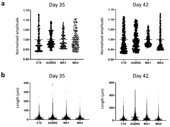 Functional assessment of the differentiated cultures. (a) Analysis of calcium transients. The characterization of calcium transients was performed at days 35 and 42 of differentiation, respectively, in the lines C10, AG09G, MA1 and MA4 by taking the values of intensity mean of at least 50 different fibres. There were no significant differences in the calcium transients of the four cell lines analysed (statistical analysis carried out with a Brown–Forsythe and Welch ANOVA test). (b) Contraction length analysis. We evaluated at least 4000 contraction events from three distinct differentiation experiments at days 35 and 42 in the lines C10, AG09G, MA1 and MA4. There were no significant differences between the values of contraction length of the four lines analysed (statistical analysis carried out with a Kruskal–Wallis test).
