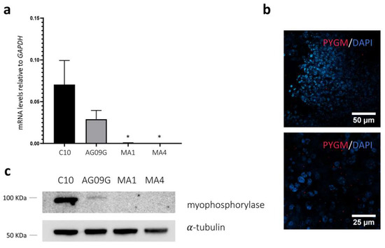 Evaluation of the expression of PYGM in the differentiated cell lines. (a) TaqMan™ assay to assess PYGM expression in the differentiated cell lines C10, AG09G, MA1, and MA4 at day 45. We can observe how the control cell lines do express PYGM as myogenic cultures, whereas both McArdle lines only maintain some negligible levels of expression. Values represent the expression mean of at least three independent replicates, relative to GAPDH as housekeeping gene. Error bars show standard deviation. * p-value < 0.05 versus control lines, one-way ANOVA with Holm–Sidak’s multiple comparisons test. (b) Immunocytochemistry analysis for the lines AG09G (above) and C10 (below). We can observe marked in red the presence of myophosphorylase in the differentiated cultures at day 30. (c) Western Blot analysis of the expression of myophosphorylase in the lines C10, AG09G, MA1 and MA4 at day 45 of differentiation. We can observe the presence of myophosphorylase in the control and its absence in the McArdle lines.
