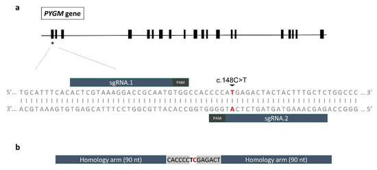 General scheme of the gene editing strategy. (a) Representation of the localization of the two designed sgRNAs targeting exon 1 of the PYGM gene. Both were selected to be placed as close to the c.148C>T; p.R50* mutation as possible, maintaining high on-target and low off-target activities. (b) ssODN repair template design. The 90-nt long homology arms leave two mutations in the centre: the edition of the c.148C>T; p.R50* target mutation (marked in red), and the introduction of a silent mutation to create a restriction site for the enzyme XhoI (c.147A>T; p.P49P, marked in bold).