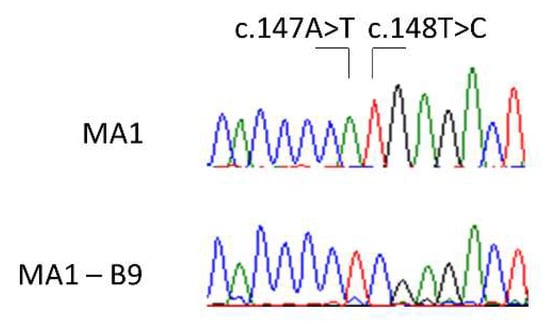 Validation of the successful edition of the selected clone MA1—B9 (below) by Sanger sequencing, compared to the MA1 origin line (above). We can observe both the modifications introduced in the edited sequence: c.147A>T and c.148T>C.