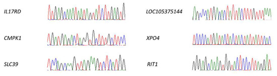 Off-targets analysis. We selected six different off-targets (IL17RD, CMPK1, SLC39, LOC105375144, XPO4, and RIT1), being the most likely ones to be modified according to the prediction algorithms. We evaluated the possible variations in their sequence by Sanger, finding no modifications in any of them. The areas shown in the image correspond to the sequences analogous to sgRNA.2, all of them identical to the reference sequence.