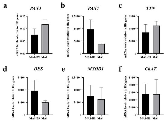 Analysis by RT-qPCR of the expression of myogenic and motor neuron genes to evaluate the process of differentiation at day 40 of the lines MA1-B9 and MA1. The expression of the genes PAX3 (a), PAX7 (b), TTN (c), DES (d), and MYOD1 (e) as myogenic markers, along with ChAT (f) as a motor neuron marker, was assessed. The positive expression of all of them certifies the presence of myogenic cells and motor neurons in the differentiated culture. The values represent the mean of at least three replicates, and they are relative to the expression of two housekeeping (HK) genes: HPRT and PPIA. Error bars show standard deviation.