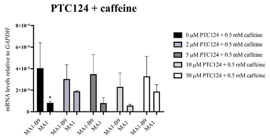 PYGM expression analysis using TaqMan™ assays after the treatment with different concentrations of PTC124 (2, 5, 10, and 50 μM) in conjunction with 0.5 mM caffeine in the differentiated lines MA1-B9 and MA1. We observed no significant differences with all the treatments evaluated between the control and the mutant line. The values are representative of at least three independent replicates, relative to GAPDH as housekeeping gene. Error bars show standard deviation. The statistical analysis was performed using a two-way ANOVA analysis with Sidak’s multiple comparisons test between the control and the mutant line for each of the concentrations (* p-value < 0.05). There were no differences between each concentration and the absence of treatment for the line MA1-B9 (p-value > 0.05, two-way ANOVA analysis with Dunnet’s multiple comparisons test).