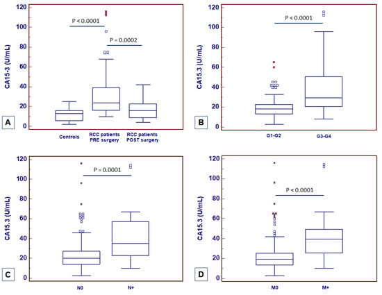 - Grankvist, K.; Ljungberg, B.; Rasmuson, T. Evaluation of five glycoprotein tumour markers (CEA, CA-50, CA-19-9, CA-125, CA-15-3) for the prognosis of renal-cell carcinoma. Int. J. Cancer 1997, 74, 233–236. [Google Scholar] [CrossRef]
